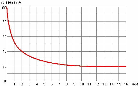 Aus dem Bereich der Lernforschung ist bekannt, dass einmal gelernte Inhalte mit zunehmender Dauer mehr und mehr vergessen werden. Das führt beispielsweise dazu, dass schon nach einem Tag die Hälfte des Gelernten bereits vergessen wird und nach zwei Wochen nur mehr etwa 20% erinnert werden kann. Wie überall bestätigen Ausnahmen die Regel. Die Grafik zeigt anschaulich diesen Ablauf.